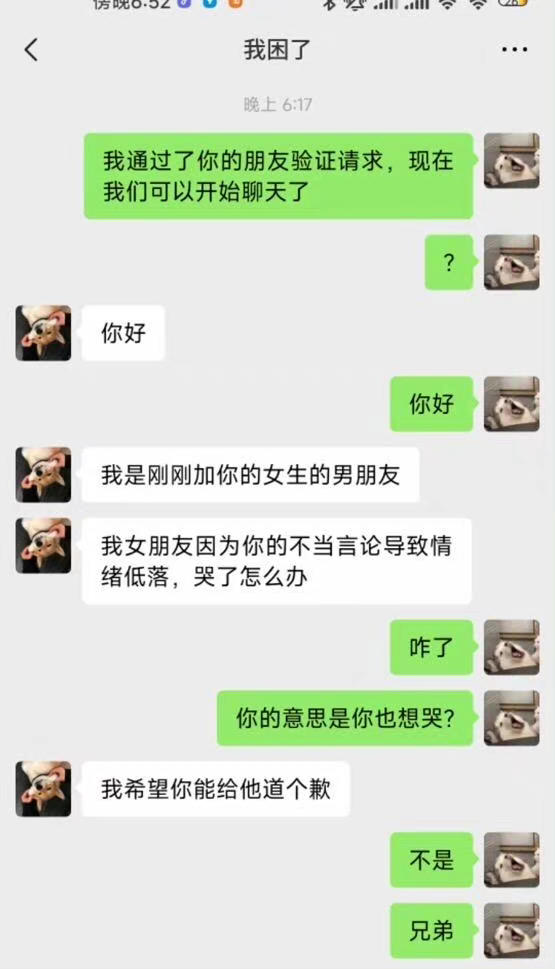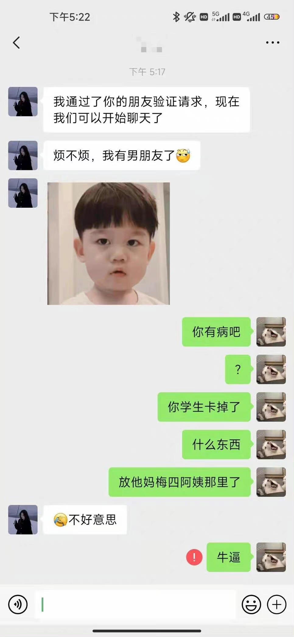 没想到这个男孩加了女生四五次之后,对方第一句话就说的是“烦不烦,我已经有男朋友了”,那这个男子表示是捡到了对方的校园卡,把对方的卡放在了阿姨那里。这个女孩子也向这个男子道歉,但是最无语的还在后面,...